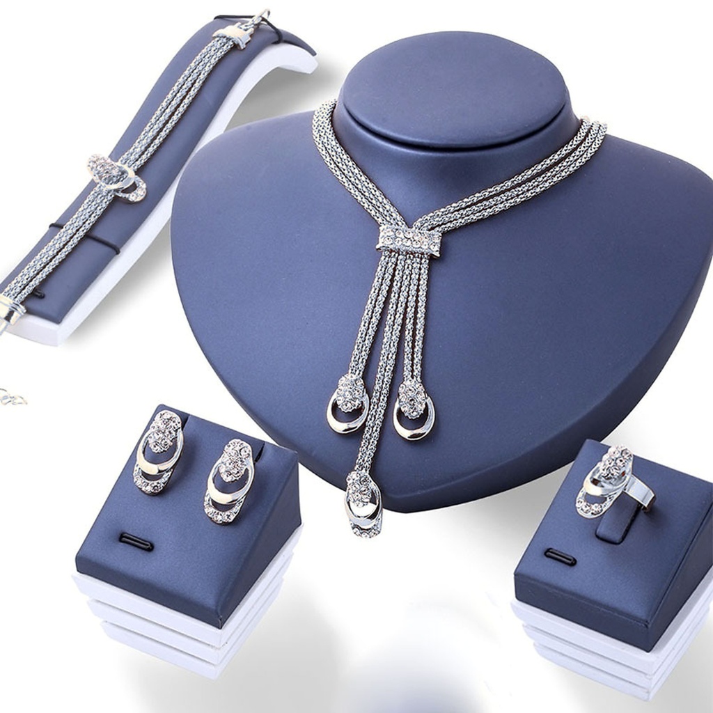 14k Beyaz Altın Kaplama Nişan Kına Düğün Parti Taşlı Kolye Küpe Bileklik Yüzük Kadın Takı Seti