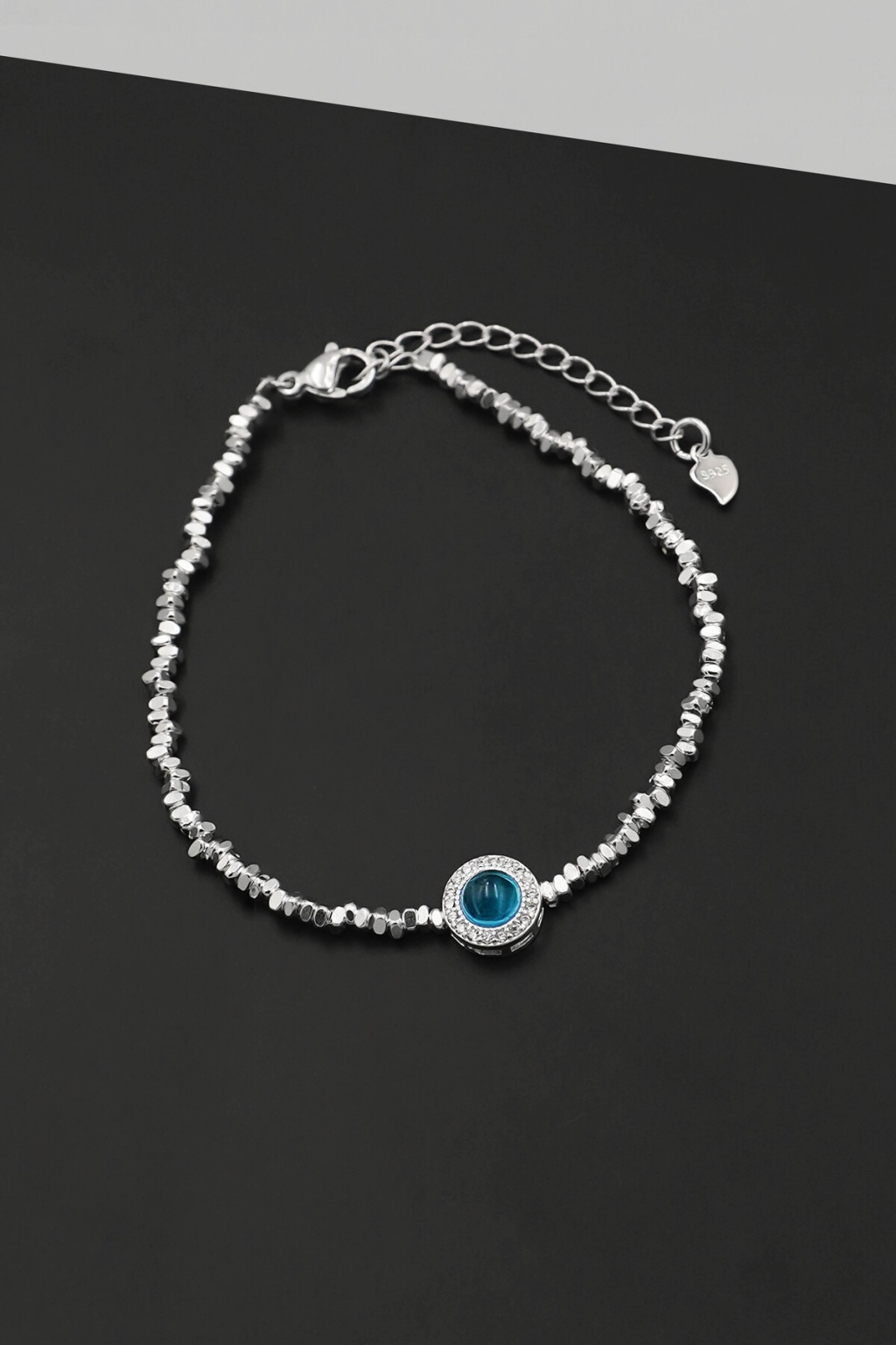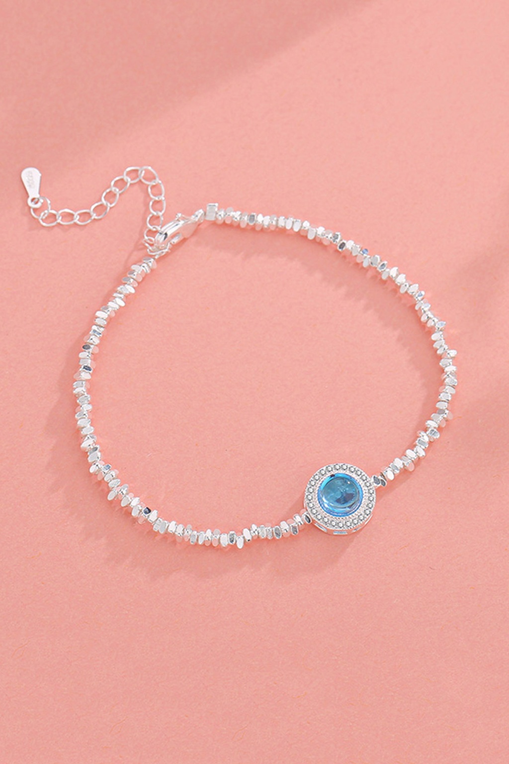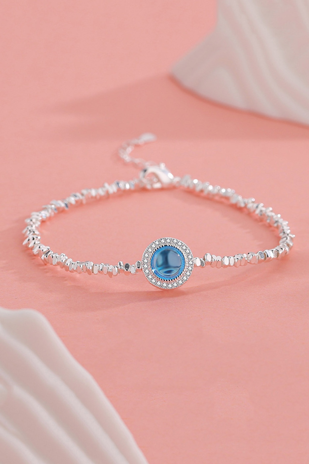Tamamı 925 ayar gümüşten üretilen bu bileklik, merkezindeki dairesel mavi taş detayı ve onu çevreleyen ışıltılı zirkon taşlarla modern bir şıklık sunar. Dokulu ve hareketli zincir yapısı, bileğinizde estetik bir duruş sergiler.
