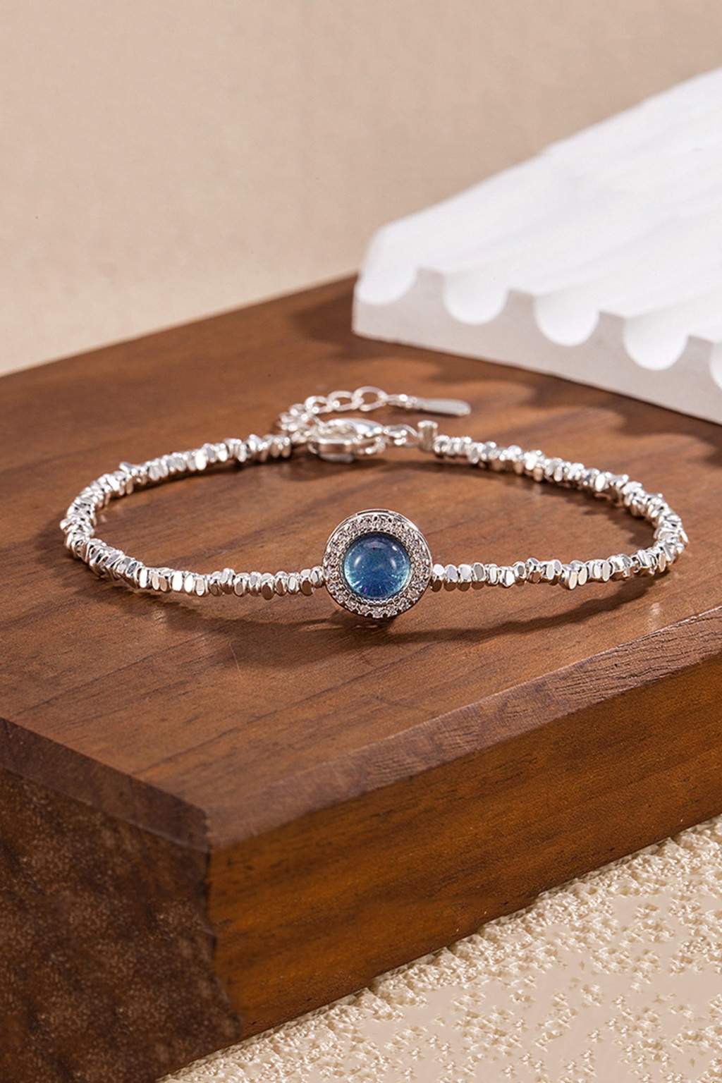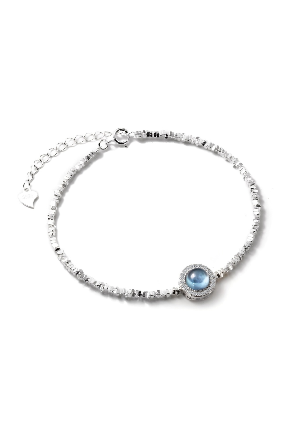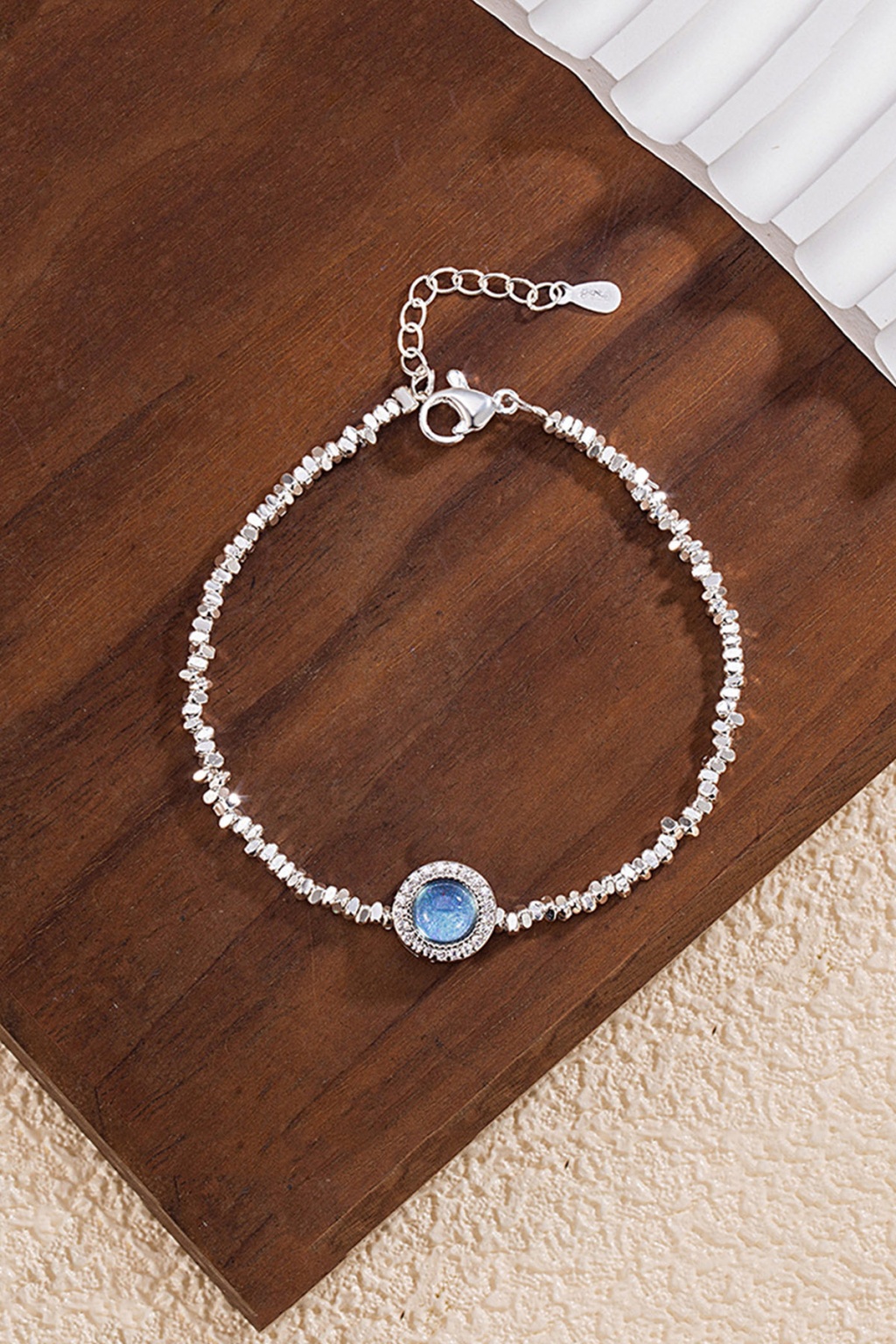 Tamamı 925 ayar gümüşten üretilen bu bileklik, merkezindeki dairesel mavi taş detayı ve onu çevreleyen ışıltılı zirkon taşlarla modern bir şıklık sunar. Dokulu ve hareketli zincir yapısı, bileğinizde estetik bir duruş sergiler.