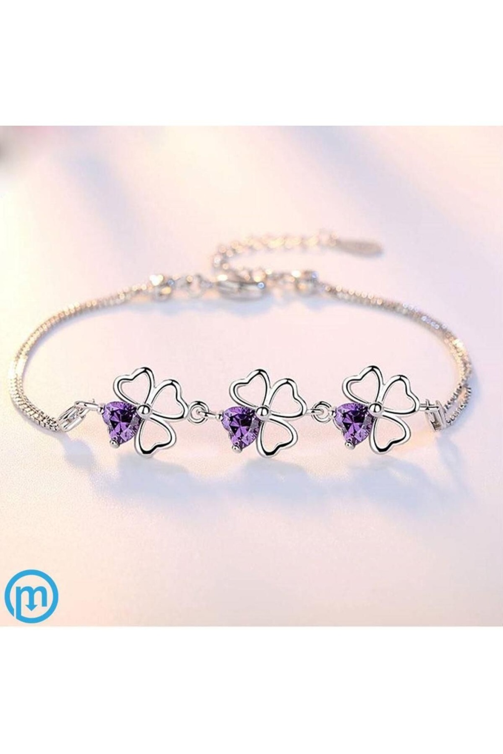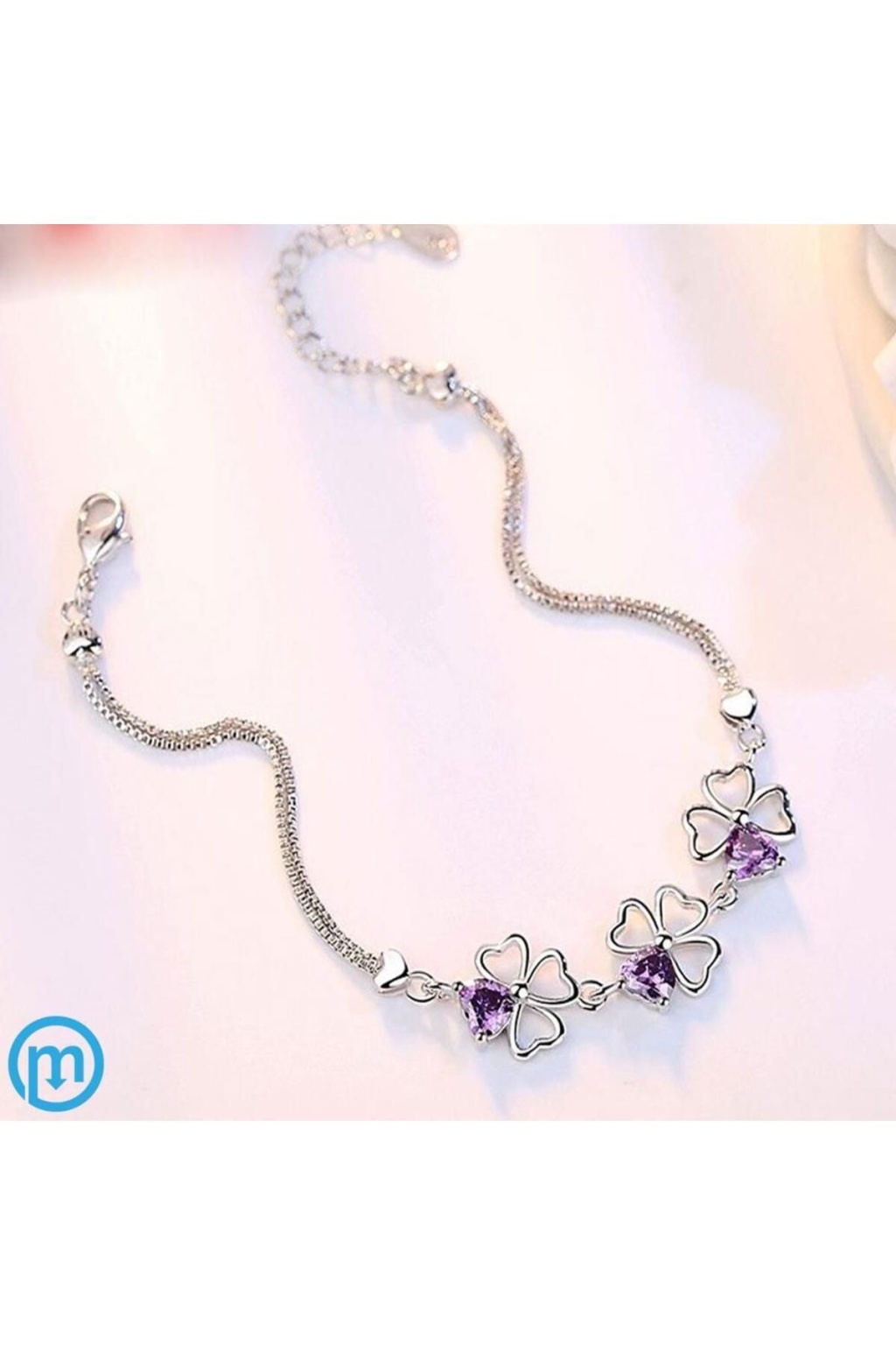 925 Ayar Gümüş Yonca Figürlü Kalpli Mor Taşlı Kadın Bileklik Sevgililer Günü Sevgiliye Hediyelik