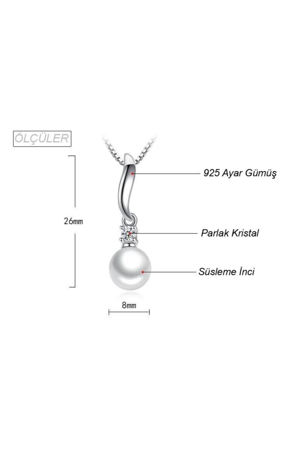 925 Ayar Damgalı İnci Taşlı Gümüş Kaplama Bayan Kolye Ürün üzerine resimlerde de görüldüğü gibi süsleme inci bulunmaktadır. Aynı zamanda inci üzerinde parlak bir kristal bulunmaktadır. Kolyede bulunan zincir uzunluğu 22cm'dir. Ürünün Ölçüleri ve Detaylı Fotoğrafları Aşağıda Bulunmaktadır, İncelemenizi Tavsiye ediyoruz Tüm takı - ürünlerinin ömrünü ve parlaklığını; parfüm, deodorant, sabun, su ve çamaşır suyu gibi maddelerden uzak tutarak uzatabilirsiniz.