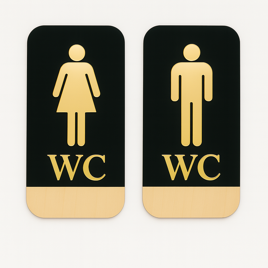 Ahşap Gold Pleksi WC Kapı Tabelası Seti – Bay Bayan Tuvalet İşareti – Akçaağaç ve Siyah Zemin