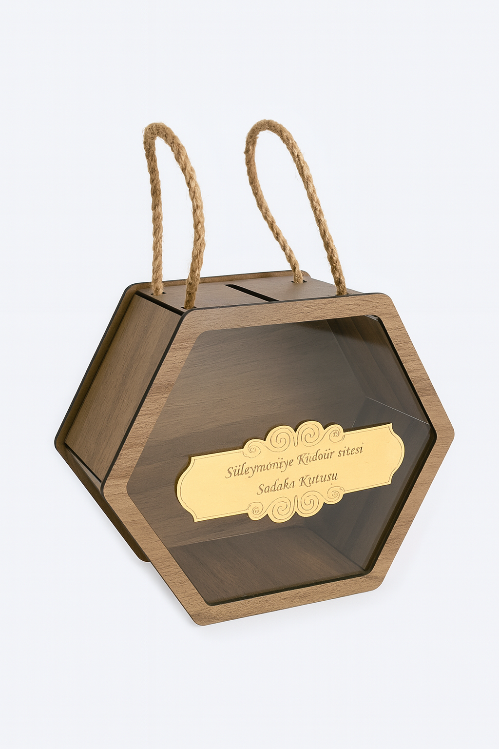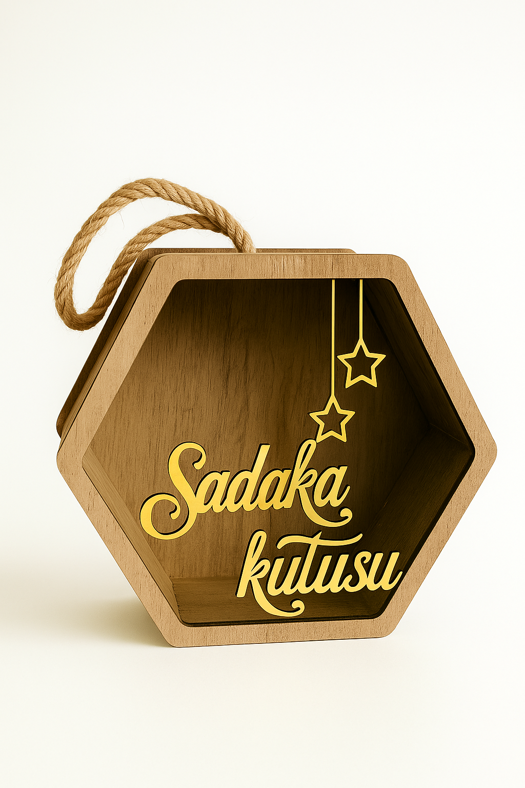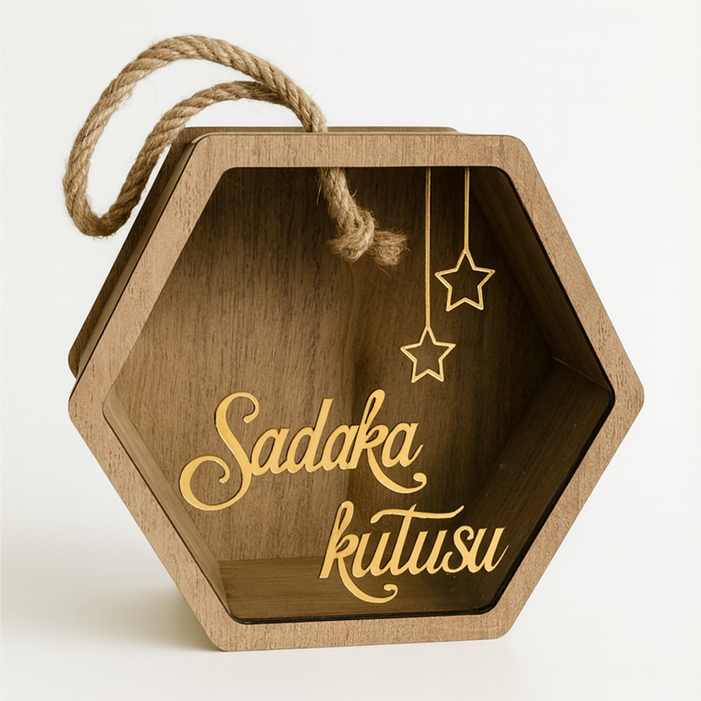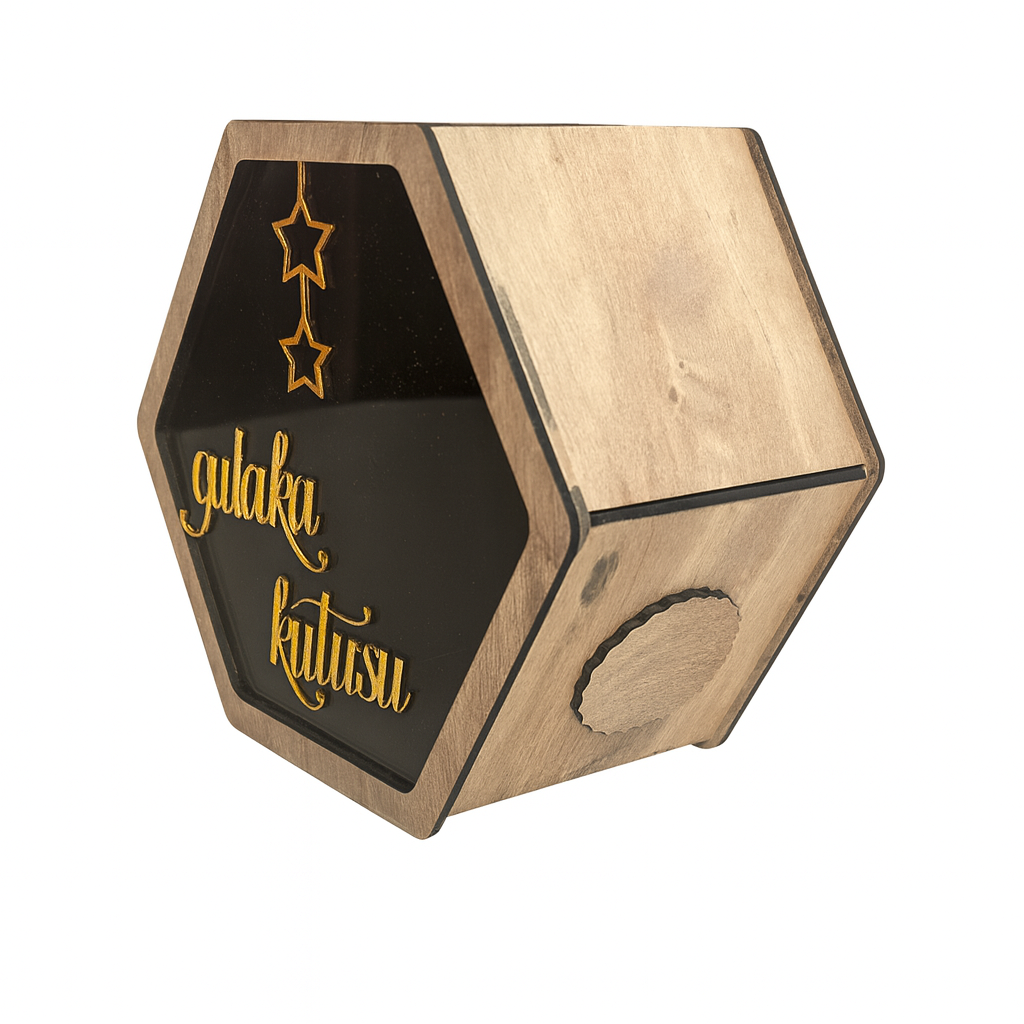 El yapımı ahşap pleksi camlı altıgen sadaka kutusu, şık tasarımı ve sağlam yapısıyla dikkat çekiyor. Üzerindeki gold yazı ve yıldız detayları, ürüne modern ve estetik bir görünüm kazandırır.