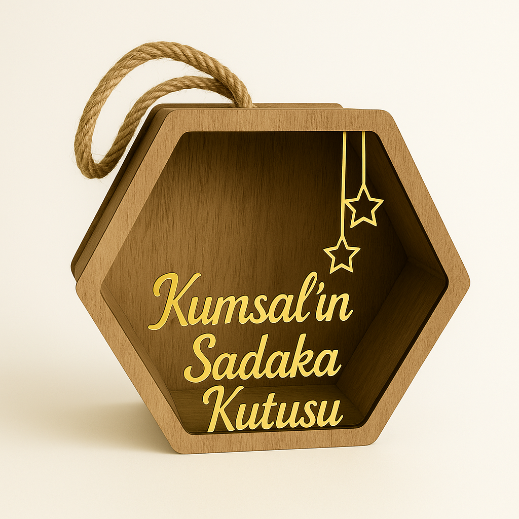 Tasarım: Altın renkli “Sadaka Kutusu” yazısı ve yıldız figürleri