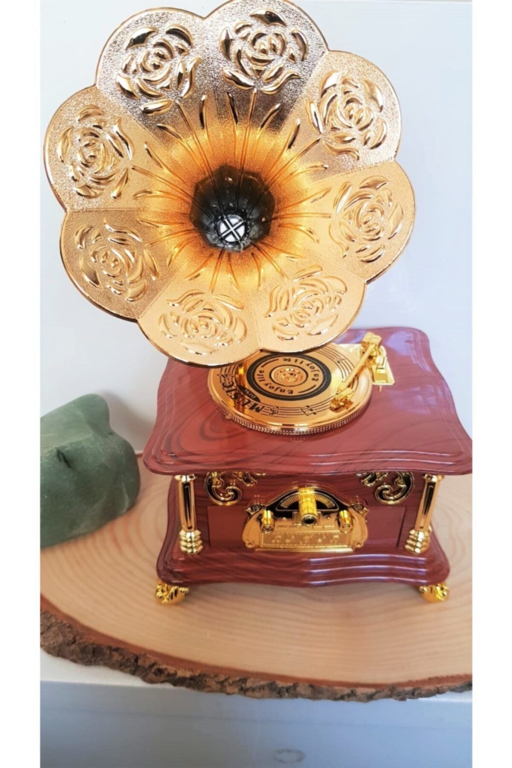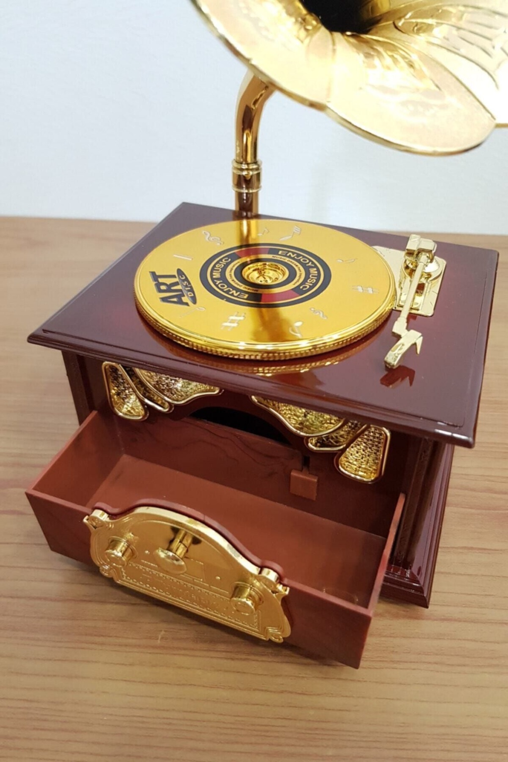 Gramofon Müzik Kutusu. ; Bu nostaljik figür, şimdi Gramofon Müzik Kutusunda tekrar hayat buluyor. ; Hiçbir detayı gözden kaçmadan tasarlanan gramofon müzik kutusunun iğnesi, sesi ileten borusu, kurma kolu ve plağı bulunuyor. ; Üstelik değerli eşyalarınızı, mücevherlerinizi ve bozuk paralarınızı saklayabileceğiniz bir de çekmecesi var. ; Arkadaki kurma kolu ile kuruyorsunuz, çekmecesini açtığınızda müzik çalmaya başlıyor, kapadığınızda susuyor. ; Müzik çalarken plak kısmı da dönüyor.;