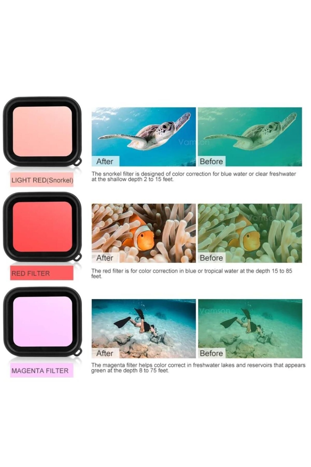 Gopro Hero Su Geçirmez Housing Uyumlu 3'lü Lens Filtresi DİKKAT: Su geçirmez kılıfınız resimlerdeki gibi değilse uyum sağlamaz ayrıca direk gopro üzerinede takılmaz sadece su geçirmez housing'e takılır.