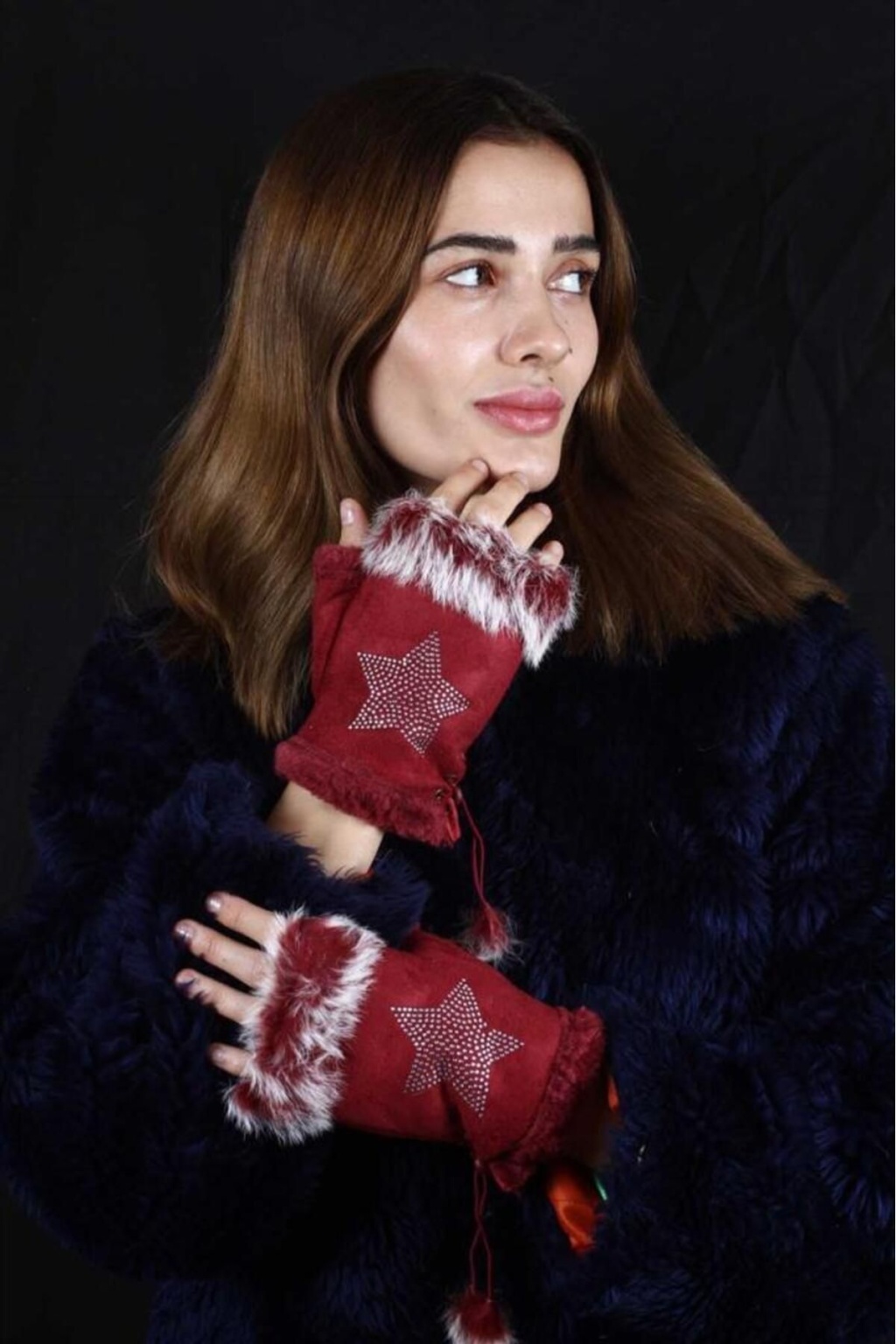Parmaksız Tasarım Yıldız ve Parıltı Taşlı Kadın Eldiven Ayarlanır